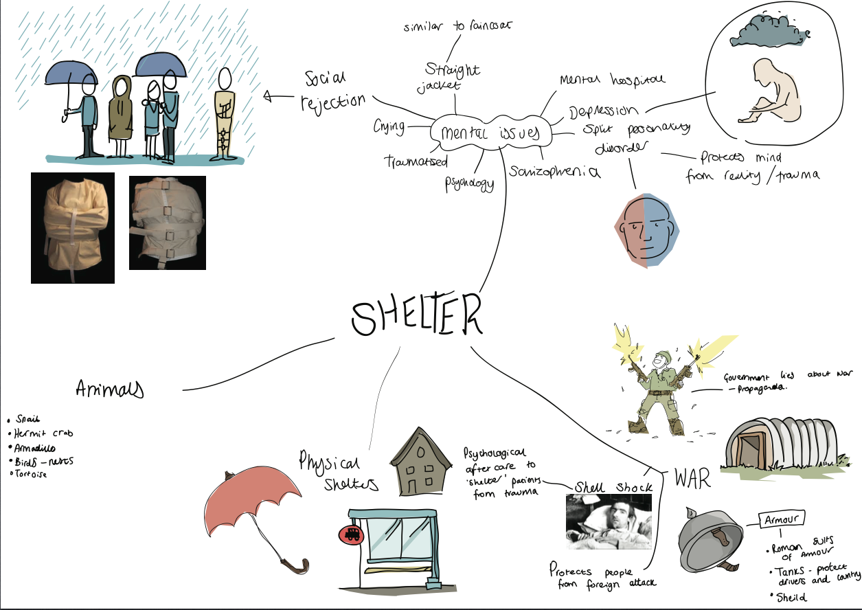 From the large, group mind map, I decided to make my own with a little more depth into the areas and ideas that interested me. I researched images related to psychological issues, as there are many forms of psychological sheltering, such as depression, repression and developing disorders. I found images of straight jackets and felt these are recognisable and almost symbolise that area of mental health. I continued to illustrate some quick sketches of ideas of how I could portray what I wanted to translate.